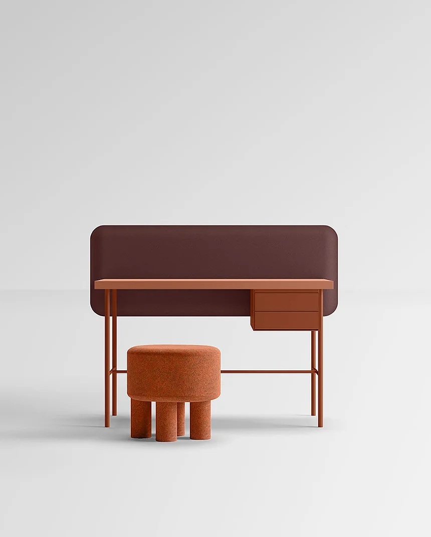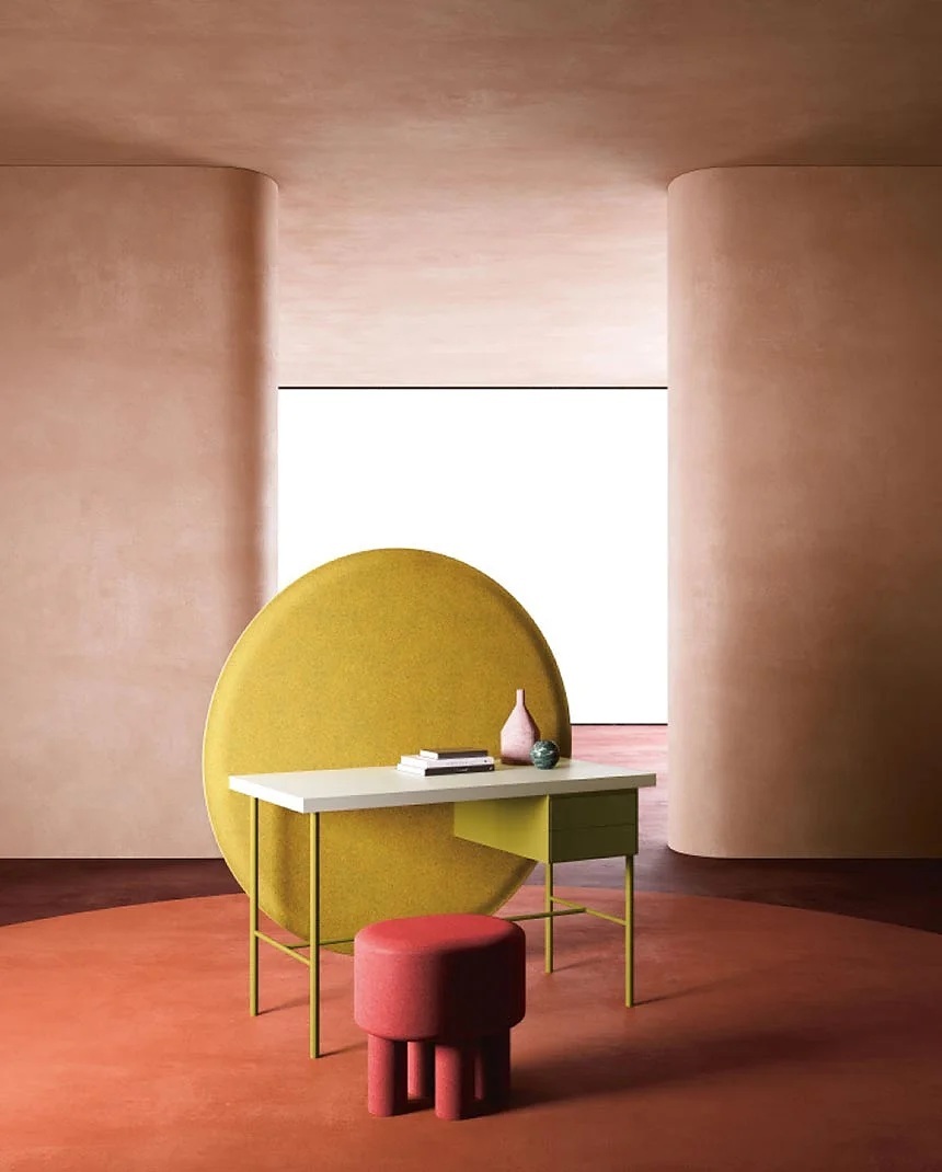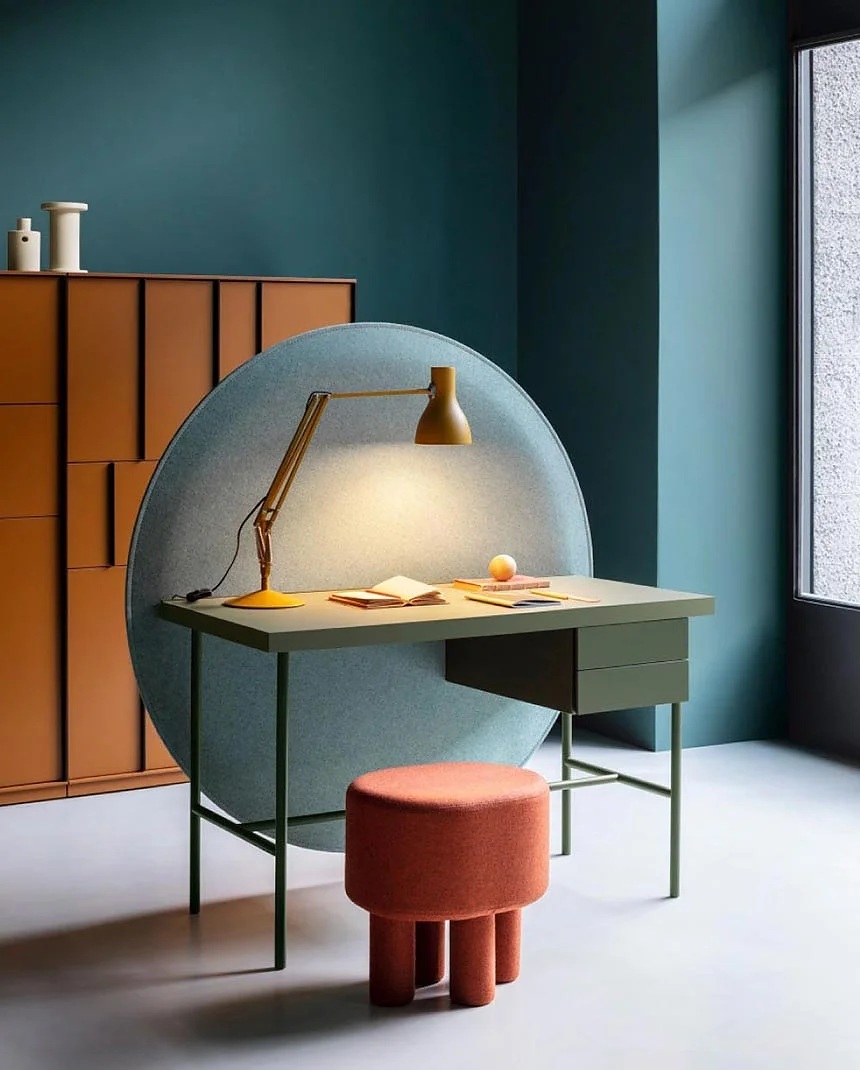 The office world is changing and increasingly requires hybridisation with domestic spaces. Dieffebi is embracing this new development and pursuing a new project for the home office and small office: a desk featuring an essential shape available in colours inspired by nature, provided with sound absorbing panels in various shapes to protect privacy and the needs of those sharing the home or work space. It is combined with a comfortable and cosy padded stool, in keeping with an informal, free approach to the working day.