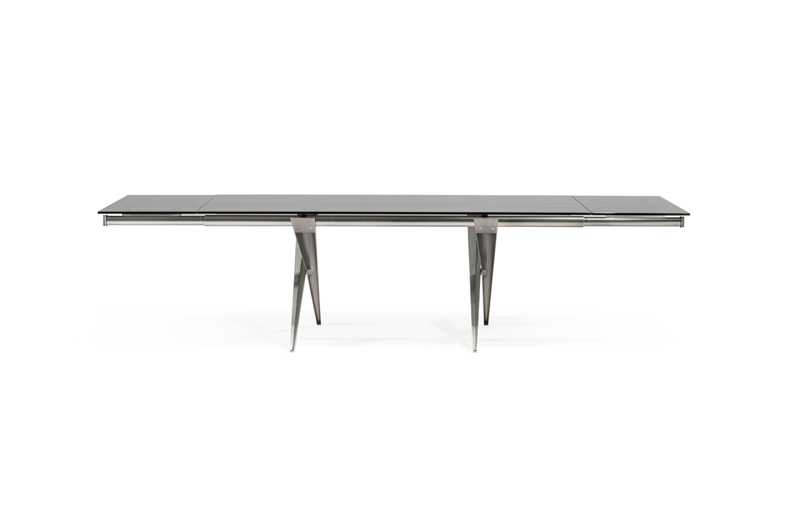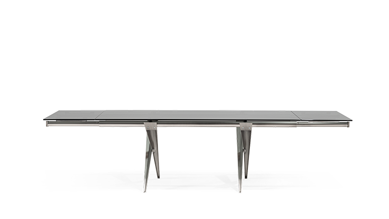 Extendible table with die-cast aluminium frame and steel tubes. Tops of glass , ceramic Oxide coupled with glass.